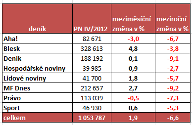 Přestože v meziročním srovnání deníků je stále patrný pokles, není tak výrazný jako v předešlých měsících. Výsledky z letošního dubna ukazují na meziroční pokles necelých 7 %. Dosud se přitom meziroční ztráta pohybovala v průměru na úrovni 9-10 %.