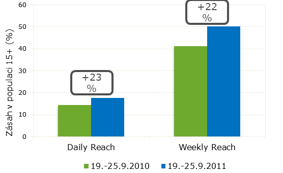 Televizní stanice TV Barrandov v meziročním srovnání aktuálního týdne (tj. v období od 19. 9. do 25. 9.) vzrostl průměrný denní zásah (daily net reach) o 3, 3 %, celkový týdenní zásah (weekly net reach) celkově o 9, 1 %. V rámci obou ukazatelů se TV Barrandov umístila na 4. místě za TV Nova, TV Prima a ČT1.