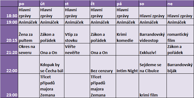 Dále pokračují zavedené pořady Sejdeme se na Cibulce, Vtip za stovku, Barrandovský Videostop či seriál Zákon a pořádek.