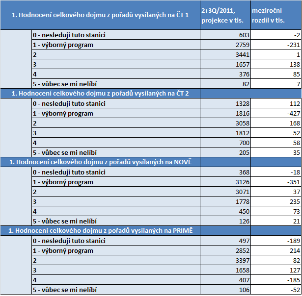 Ve stejném loňském období např. o 231 tis. diváků více uvádělo, že považují programové vysílání kanálu ČT1 za výborné, na stanici ČT2 to dokonce bylo o 427 tis. diváků více. Snížení výborného hodnocení se dotklo i TV Nova (-351 tis. diváků), naopak TV Prima jako jediná stanice ze sledovaných čtyř zaznamenala meziročně vyššího počtu diváků, kteří její program hodnotili jako výborný (+214 tis.).