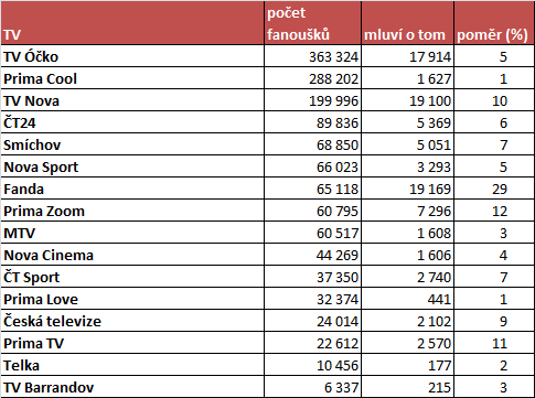 Počet fanoušků českých televizních stanic na sociální síti Facebook se stále zvyšuje. Na hranici 200 tisíc fanoušků letos dosáhla TV Nova, která v letošním roce počet fandů ztrojnásobila – v lednu 2013 jich měla přes 60 tisíc. Televizními stanicemi, které mají nejpočetnější fanouškovskou základnu, jsou TV Óčko, Prima Cool a TV Nova. Zmíněné tři stanice jsou z pohledu počtu fanoušků na facebooku nejúspěšnějšími značkami na této sociální síti. Nova vykazuje lepší ukazatel „mluví o tom“, aktuálně je to cca 10 % jejích fanoušků, zatímco u Prima Cool je to jen 1 % a u TV Óčko 5 %.