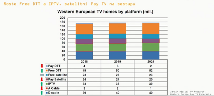 Podle dat Digital TV Research, které na červnové konferenci Digimedia prezentoval Marcel Procházka z Českých Radiokomunikací, se v západní Evropě mírně zvyšuje počet domácností, které ke sledování televize využívají terestrickou digitální platformu (FTA), kabelovou digitální platformu a nejvýrazněji roste počet domácností využívajících sledování přes internet (IPTV). Podle trendů predikovaných do roku 2024 se má naopak snižovat využívanost placeného digitálního terestrického příjmu, placeného satelitu a analogového kabelu. Naopak dál porostou především IPTV a digitální terestrika zdarma (FTA).
