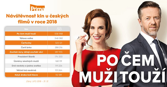 Skupina Prima byla hlavním partnerem čtyř z divácky nejúspěšnějších českých filmů loňského roku. Byla mezi nimi také komedie Rudolfa Havlíka Po čem muži touží, kterou v kinech zhlédlo 558 988 diváků, což ji vyneslo na první příčku návštěvnosti českých filmů.