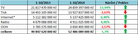 I v říjnu pokračoval podle monitoringu investic Admosphere růst výdajů do televizní reklamy. V meziročním srovnání si v říjnu televize polepšila o 13 %. Za období prvních deseti měsíců letošního roku představuje nárůst investic do televizní reklamy 14 %. Investice do televizní reklamy jsou tak za letošní období leden-říjen v hrubých číslech vyšší o tři miliardy korun než ve stejném období loni. Podle monitoringu jsou letošní celkové hrubé mediální investice zatím o 5 % vyšší než za stejné období loni.