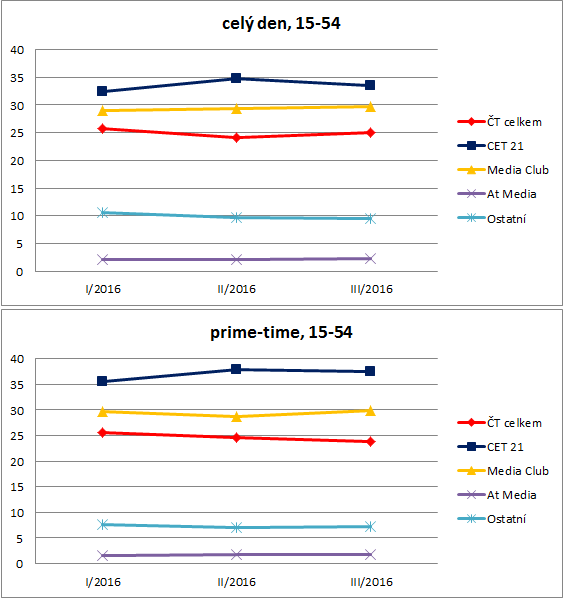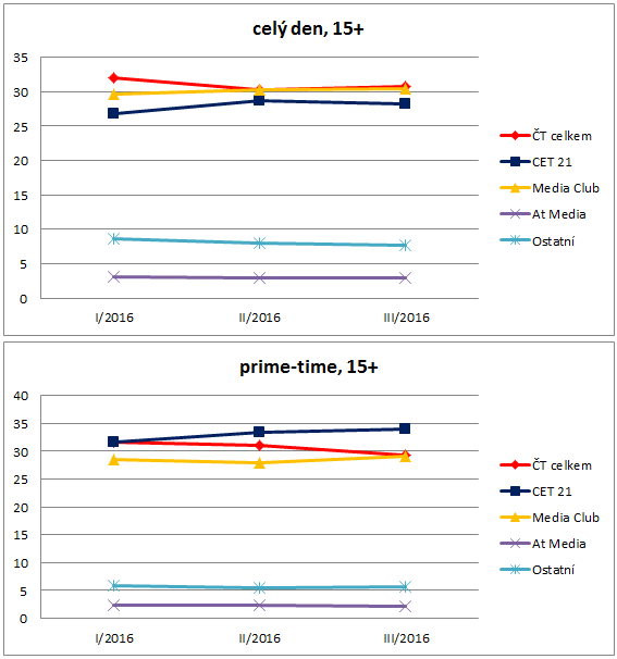 V nejširší skupině 15+, na kterou prodává reklamu Česká televize, má ČT čtvrtletně nejvyšší podíl v celodenním vysílání (31,02 %) těsně před MediaClubem (30,09 %), zatímco v hlavním vysílacím čase dosahuje nejvyššího podílu CET 21 (čtvrtletní průměr je 32,3 %).