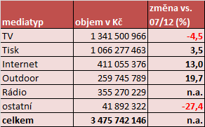 Oproti vývoji z počátku letošního roku jde ale o zmírnění poklesu a v červenci se televizní reklama alespoň v hrubých investicích přiblížila loňskému červenci, což je z hlediska trendu nejlepší letošní výsledek. Celkově je ale hrubá ztráta TV reklamy v letošním roce vyšší než 1 mld. Kč (za období leden až červenec 2013 je to meziročně méně o 1,2 mld. Kč, tj. o 8 %).