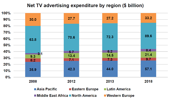 V kontrastu se situací v Evropě se ale naopak daří jihoamerickému regionu: v období dekády (2008-2018) se má její objem zdvojnásobit, a to díky ekonomickému růstu, fotbalovému mistrovství v Brazílii a olympijským hrám. V Evropě je však zvýšení ve stejném období odhadováno na úrovni 11 % (západní Evropa). Ve východní Evropě má být růst tažen jen zásluhou ruského trhu. Z hlediska podílu zůstává nejsilnějším regionem s objemem TV reklamy Severní Amerika (40 % globálních investic).
