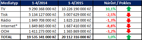 Objem hrubých reklamních investic na českém trhu je za období prvních letošních čtyř měsíců vyšší než v loňském roce o necelých 600 mil. korun, což představuje meziroční nárůst o 3 %. Vyplývá to z monitorovaných investic společnosti Admopshere. Na hrubém zvýšení investic se podílí především televizní reklama. Meziroční monitorovaný nárůst představuje za období leden až duben 2015 ve srovnání se stejným obdobím loni 10 % (tj. téměř 940 mil. Kč).