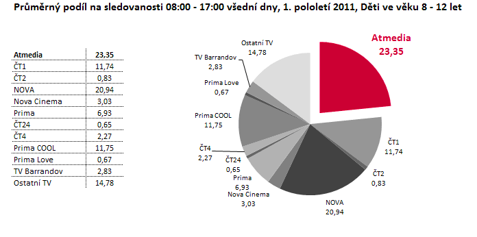 Tematické kanály z portfolia Atmedia dosáhly za první pololetí letošního roku nejvyššího podílu na sledovanosti u mladých diváků v cílové skupině 8 - 12 let. Kanálům Atmedia se podařilo stát se v prvním pololetí tohoto roku jedničkou na trhu v uvedené CS, když dosáhly podílu na sledovanosti 23,35% a to ve všední dny mezi 8 - 17 hodinou.