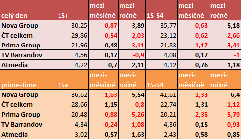 Díky hudebním televizím potvrzuje rostoucí trend Atmedia, která se v celodenních číslech v obou sledovaných cílových skupinách přehoupla přes 4% podíl.
