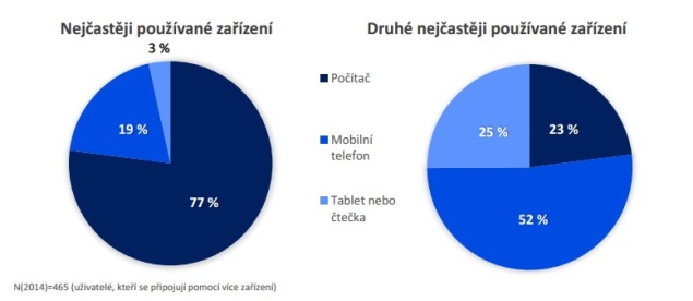 I přes rozmach užívání smartphonů a tabletů platí, že pro své online aktivity lidé nejčastěji využívají počítač – právě ten nejčastěji využívají tři čtvrtiny respondentů, kteří mají k dispozici více těchto zařízení. Druhým nejčastěji používaným zařízením je mobilní telefon. Jeho přínos odráží zjištění, že během pohybu (v dopravním prostředky nebo na ulici) používají čeští uživatelé internet v průměru 5 hodin týdně.