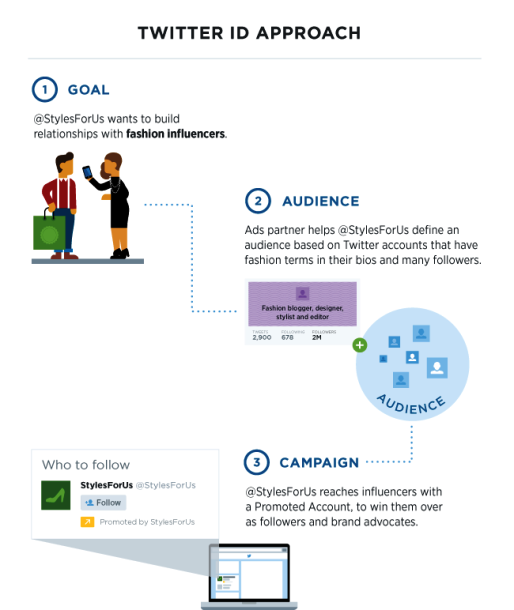 Kromě toho Twitter umožňuje zadavatelům také zacílit na influecery, a to na základě klíčových slov v tweetech i v profilech uživatele a počtu followerů. Bude-li chtít například módní řetězec zasáhnout sponzorovaným tweetem módní influencery, hledat se budou podle klíčových slov a těm s největším množstvím followerů bude zaslán sponzorovaný tweet.