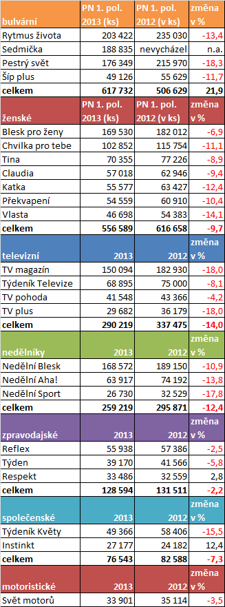 Mezi bulvární týdeníky se úspěšně etablovala Sedmička, která přešla do podoby bulvárního týdeníku loni v létě. V pololetí dosáhl její průměrný prodej 189 tis. kusů, což znamenalo lepší výsledek než u Pestrého světa, který nástup Sedmičky pocítil nejvýrazněji. Díky příchodu Sedmičky se celý segment bulvárních týdeníků meziročně zvedl o 22 %. Jde o jediný nárůst v rámci jednotlivých segmentů mezi týdeníky.
