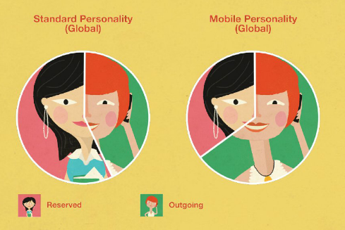 Mobilní telefon má také zásadní vliv na sebepojetí člověka. Zatímco v osobním kontaktu se jako otevřená osobnost popsalo 43 % respondentů, s mobilním telefonem již 65 %. Více než polovina respondentů (52 %) rovněž přiznala, že jsou přes mobilní telefon častěji v pokušení být neslušní než při osobním kontaktu.