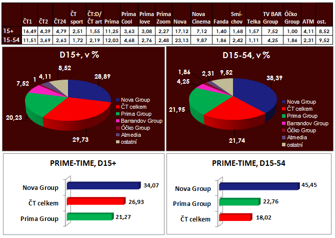 Soutěžní pořad Zpívá celá rodina (ČT1) se stal nejsledovanějším sobotním večerním pořadem po 20. hodině v cílové skupině 15+. V průměru ho sledovalo přes 520 tis. diváků starších 15 let (podíl 17 %). U mladších diváků 15-54 bylo ale úspěšnější pokračování snímku Hunger Games (Nova), který v této mladší divácké skupině dosáhl 23% podílu. Nadprůměrně si v sobotu večer vedla Nova Cinema, která nabídla filmovou adaptaci Účastníků zájezdu. Dosáhla sledovanosti 408 tis. diváků starších 15 let při podílu 14 % (D15+) a 19 % (D15-54). I to přispělo k celkovému výsledku skupiny Nova v mladší cílové skupině 15-54 v hlavním vysílacím čase, kdy překročila 45% podíl.