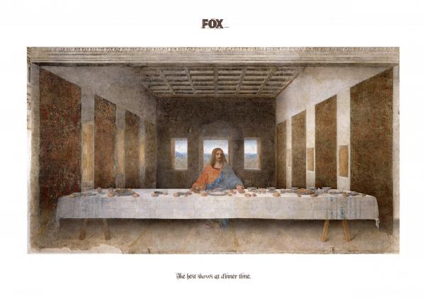 Americká televizní společnost Fox nechala pro změnu Ježíše za stolem samotného. Slogan „Nejlepší show v době večeře“ (The best shows at dinner time) vysvětluje, že se není čemu divit.
