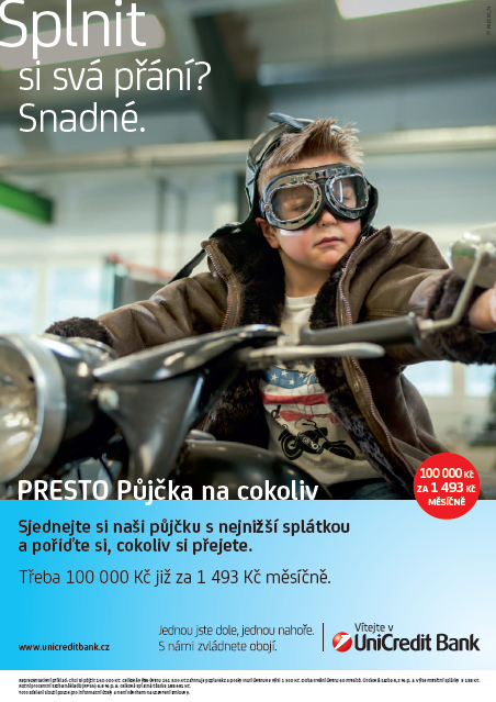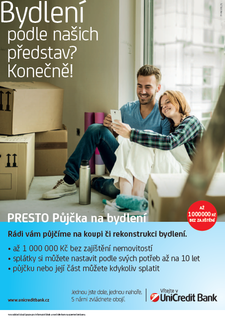 UniCredit Bank od 29. března spouští kampaň na podporu svých půjček – Presto Půjčky na bydlení a také Presto Půjčky na cokoliv. Dobu splácení, včetně výše měsíční splátky si klienti mohou nastavit podle svých potřeb. Vedení úvěru je navíc bez poplatků, půjčku lze kdykoliv předčasně splatit, nebo si splátku naopak až pětkrát odložit.