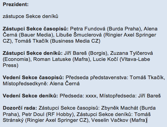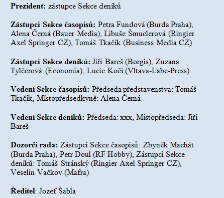 Za Sekci deníků zasedají ve správní radě Jiří Bareš (Borgis, místopředseda sekce), Zuzana Tylčerová (Economia) a Lucie Kočí (Vltava-Labe Press). Čtvrtý člen zatím jmenován nebyl. Kdo se stane novým předsedou Sekce a následně se stane i prezidentem, je otázkou, která se právě řeší. Vydavatelé mohou zvolit i jiný postup a nominovat do předsednictví Sekce deníků některého jiného zástupce, který by se následně stal prezidentem Unie vydavatelů.