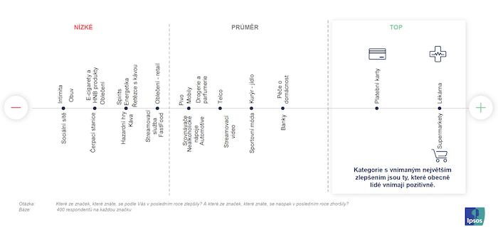 Z průzkumu, který analyzoval 300 značek na českém trhu, vyplývá, že si za posledních 12 měsíců v očích spotřebitelů 4,7 % značek polepšilo, naopak 1,3 % si pohoršilo. Se současnou situací si nejlépe poradily značky v kategoriích platebních karet, supermarkety a lékárny. „Obecně lépe se umístily kategorie, které jsou relevantní pro širokou cílovou skupinu a zároveň jsou často využívané. Jsou prostě výrazné. Supermarkety toto jednoznačně splňují, a jako bonus se dokázaly se dobře poprat s aktuálním makro kontextem vysokých cen tím, že přesvědčily své zákazníky, že za ně nemohou. Jejich zákazníci si zvykli nakupovat ve slevách (za což supermarkety oceňují) a zároveň je pro ně nákup určitou malou radostí. U lékáren funguje opět široká relevance. Navíc být lékárník je stále profese, která má svoji reputaci, a obecně je to business, který pomáhá lidem, když jim není dobře,“ vysvětluje Michal Štěpánek, Executive Director agentury Ipsos, a dodává: „I pro platební karty platí, že je to široce relevantní kategorie, která je v podstatě rozdělená mezi dvě velmi silné značky – většina z nás vlastní buď jednu, nebo druhou, nebo obě. Navíc nás – přinejmenším z pohledu spotřebitele – karta vůbec nic nestojí, usnadňuje nám život. A o to více, že Češi platí stále více kartou, třeba z recyklovaného plastu nebo tokenizovanou.“