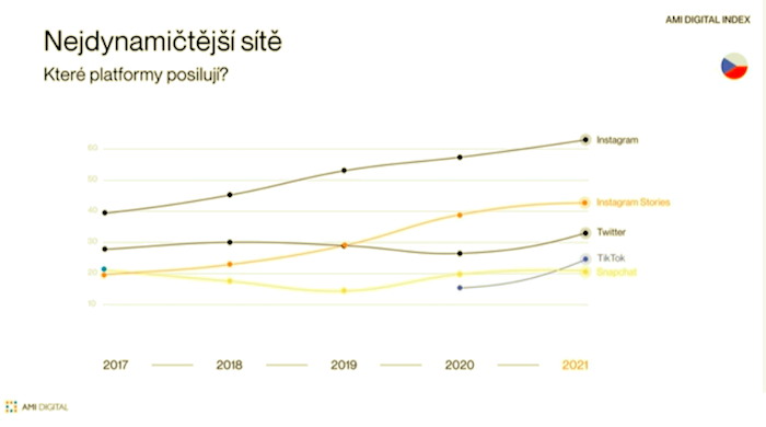 Na vrcholu žebříčku nejpoužívanějších sítí se i nadále drží dvojice YouTube a Facebook, které se řadí rovněž k těm nejdéle sloužícím a oslovuje v průměru nejstarší uživatelskou základnu. Vedle nich si svůj prostor již několik let vydobývá o poznání „mladší“ Instagram, který své uživatele láká na nové formátu, jako jsou Stories nebo Reels. Kromě toho však posilují i sociální sítě, které jsou určeny primárně pro mladé. TikTok dnes používá v průměru 21 % Čechů, Snapchat 17 %.