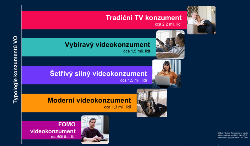 Studie Nielsen Admosphere rovněž přináší typologii televizního diváka. Největší skupinu představuje tradiční TV konzument (cca 2,2 mil. lidí), kam patří tradiční televizní diváci kolem 50 let, kteří většinou sledují televizi terestricky. Druhá nejpočetnější je skupina vybíravých videokonzumentů, která je podobná první uvedené, ale tito diváci si více vybírají, jaké obsahy sledují. A tato skupina zároveň rychle roste. Podobně velká je skupina šetřivých silných videokonzumentů, která za videoobsah zatím nemůže nebo nechce platit. Do skupiny moderních videokonzumentů se pak řadí diváci, kteří jsou většinou do 35 let, často ani nemají TV přijímač, sledují videa na sociálních sítích a jsou ochotní za sledování obsahu platit. Poslední skupina konzumuje co možná nejvíce videoobsahu, většinu této skupiny (63 %) tvoří muži.