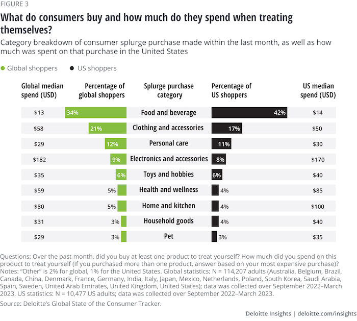 Podle Deloitte si občas dopřává většina společnosti, činí tak tři ze čtyř spotřebitelů (77 %), a to i přesto, že jen 42 % uvedlo, že si to může finančně dovolit. S nízkým příjmem si něco pro radost koupí 72 % populace, s vysokým 81 %. Nejméně tak činí zástupci generace Baby Boomers (70 %), nejvíce nejmladší generace Z (85 %). Marnotratné nákupy dělají častěji lidé v zemích jako USA, Kanada, Švédsko či Austrálie, nejméně v Japonsku.