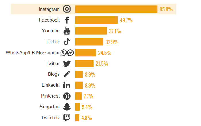 Platformou číslo jedna i nadále zůstává Instagram, který preferuje 95,8 % marketérů. S velkým odstupem následuje Facebook (49,7 %) a YouTube (37,1 %). Stále mladý TikTok se dostal v pořadí na čtvrté místo (32,9 %).