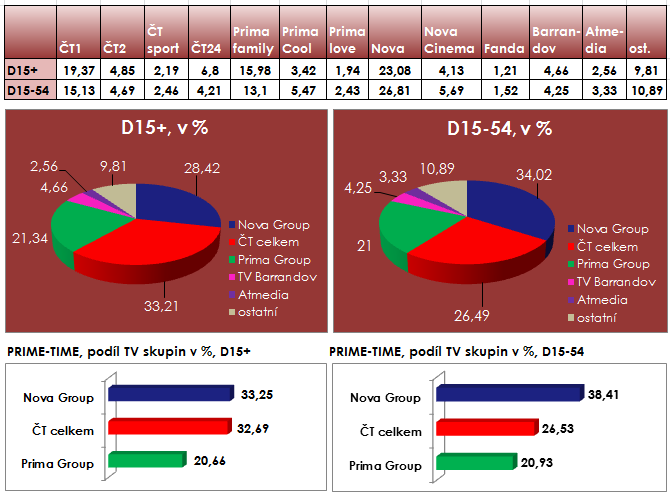 Zájem o prezidentské volby přinesl v prvním letošním měsíci zpravodajskému kanálu ČT24 nejvyšší nárůst podílu ve srovnání s prosincem 2012 (+2,23, D15+). Také díky posílení podílu ČT2 (+0,5) se souhrnný podíl všech stanic ČT v lednu oproti prosinci zvýšil nejvíce ze všech TV skupin (+2,36). Skupina Prima dosáhla v lednu srovnatelného podílu jako v prosinci (+0,3, D15+), skupina Nova poklesla ve skupině 15+ v souhrnu o 2,5 bodu, ve skupině 15-54, na kterou prodává reklamu, se její podíl ve srovnání s prosincem snížil o 1 procentní bod.