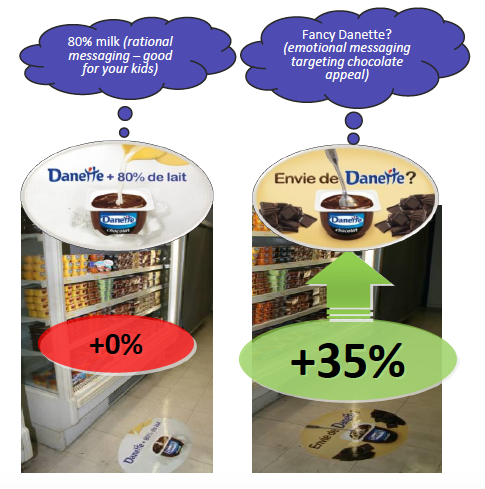 V neposlední řadě hraje roli i vhodně zvolená komunikace, která by opět měla být schopná apelovat na intuitivní a automatický systém 1 v nás. Například podlahová grafika se správným sdělením dokázala značně ovlivnit nákupní rozhodnutí zákazníků značky Danette, u níž mnohem lépe fungovalo emočně zabarvené sdělení „Máte chuť na Danette?“, které dosáhlo o 35 % prodejů více než racionální informace „Danette – 80 % mléka“.