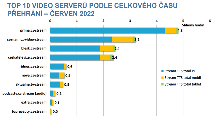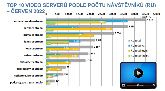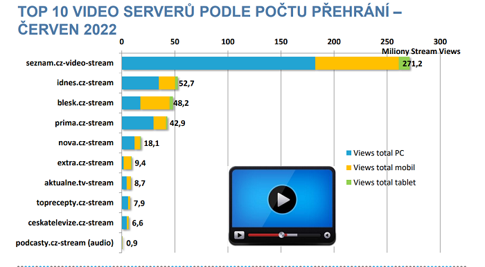Pořadí online video serverů podle počtu měsíčních návštěvníků (RU) vychází nejlépe pro Seznam.cz (video-stream) s 4,5 mil. RU v červnu 2022 před Blesk.cz (stream) s 3,7 mil. a Prima.cz (stream) s 3,05 mil. Z pohledu počtu přehrání vede s náskokem Seznam.cz před iDnes.cz a Blesk.cz. Naopak podle celkového stráveného času má nejsilnější postavení Prima.cz s 4,8 mil. hodin, pak následuje Seznam.cz (3,2 mil. hodin) a Blesk.cz (2,4 mil. hodin).