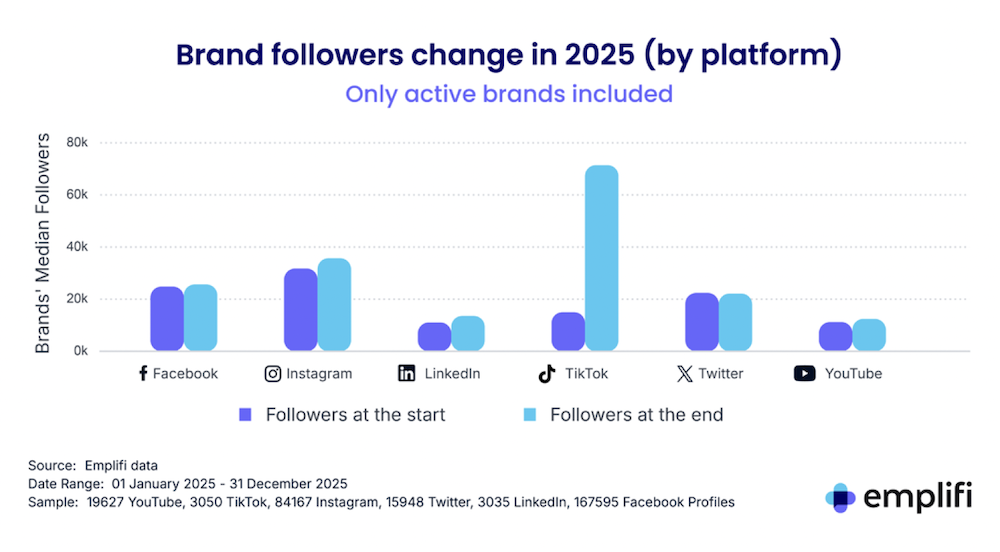 TikTok se stává prostorem zaslíbeným komunikaci značek. Podle dat společnosti Emplifi, jež porovnává výkonnost desítek tisíc globálních značek na sociálních sítích, zaznamenal TikTok v loňském roce meziroční nárůst mediánu počtu sledujících značek o 200 %, což znamenalo nejvyšší úroveň růstu počtu sledujících a zapojení značek.