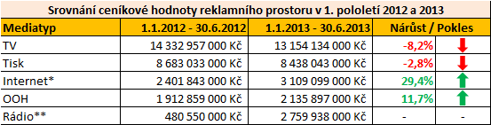 *Internet zahrnuje pouze reklamu v rozsahu projektu AdMonitoring.**Admosphere, s.r.o. od ledna 2013 nově přešla na nezávislý monitoring rozhlasu, meziroční srovnání tedy není možné, v současné době je do monitoringu zařazeno 85 rozhlasových stanic.