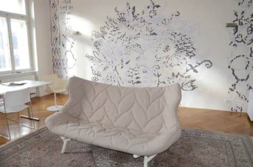 Prostor Tančící kuchyně je dekorován stylizovaným cibulákovým vzorem, který je v moderním duchu digitálně rozostřen. Každá z místností je přitom provedena v trochu odlišné barvě: kuchyně je laděna do šedorůžových tónů, tančírna do antracitově šedé s tmavě fialovou, což jí má dodat na magičnosti a podporovat tvořivost, klubovna, určená pro workshopy, využívá cibulák v abstraktní podobě v šedé a růžové barvě.