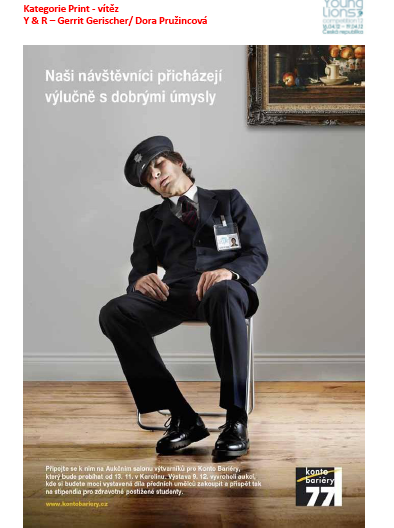 Vítězem národního kola soutěže Young Lions v kategorii print se stali zástupci agentury Young & Rubicam – Gerrit Gerischer a Dora Pružincová. Budou tak reprezentovat Českou republiku na reklamním festivalu v Cannes. Nejlépe se podle poroty vypořádali s úkolem vytvořit kampaň k letošnímu Aukčnímu salónu výtvarníků pro Konto bariéry.