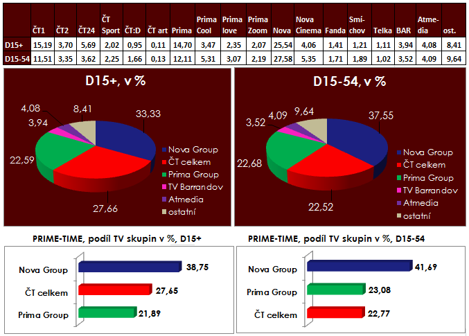Stanice skupiny Nova v říjnu oproti září mírně snížily podíl v hlavním vysílacím čase (15+ i 15-54). Ve své hlavní cílové skupině 15-54 si v celodenním vysílání vedly ve srovnání se zářím stabilně. Meziročně je sledovanost kanálů skupiny Nova stále o téměř tři procentní body nad úrovní října 2012, nejviditelnější navýšení se týká hlavního vysílacího času ve skupině 15+. Skupině pomáhají zejména nové kanály (Smíchov, Fanda, Telka) a stabilní nebo mírně lepší výsledek hlavního kanálu Nova.