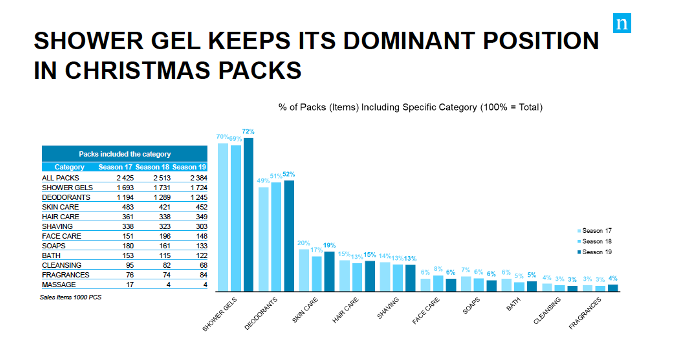 Nejoblíbenější jsou balíčky se sprchovými gely, deodoranty a s odstupem i péčí o pleť. Preference jsou značně ovlivněny tím, co výrobci do balíčku dávají. V poslední době na popularitě získávají také krémy proti stárnutí, které vybrané značky nabízejí v kombinaci denního a nočního krému (někdy i celoročně).