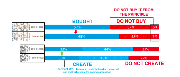 Zatímco počet spotřebitelů, kteří vánoční balíčky kupovali, meziročně klesl ze 65 % na 57 %, narostlo množství lidí, kteří si vánoční balíček raději sami vyrobili, a to konkrétně o 4 pb. na 77 %.