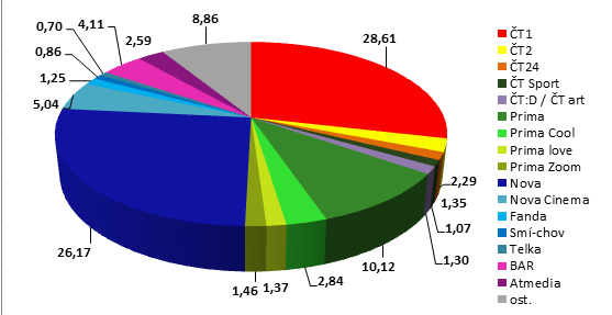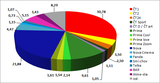 Nejvyššího podílu v době vánočního vysílání dosáhla v obou sledovaných cílových skupinách ČT1 před TV Nova a televizí Prima.