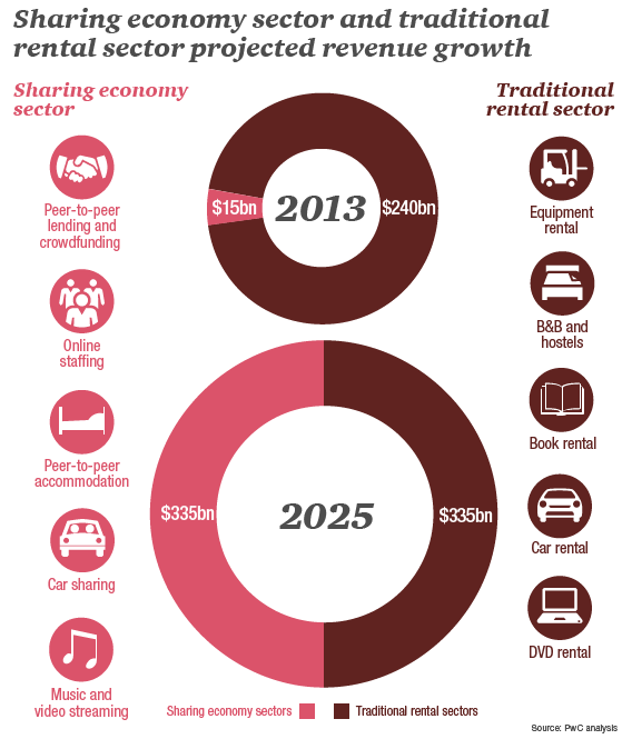 Sdílená ekonomika neboli „sharing economy“ zažívá v posledních letech i na českém trhu růst. Češi postupně přicházejí na chuť směně, výměně a peer-to-peer, dnes už běžně využívají platformy pro taxi služby, jako je domácí Liftago nebo mezinárodní Uber, na dovolenou si hledají ubytování přes AirBnB a půjčovat si začínají od lidí přes Zonky. Výhled do budoucna je pro subjekty sdílené ekonomiky navíc více než pozitivní. Podle odhadu společnosti PwC by měl její globální obrat v roce 2025 dosáhnout 335 miliard dolarů, tedy o 320 miliard dolarů více, než tomu bylo v roce 2013. S nárůstem obratu se bude zvyšovat i její podíl na poli nájemních služeb, z dnešních 5 % na celou polovinu.
