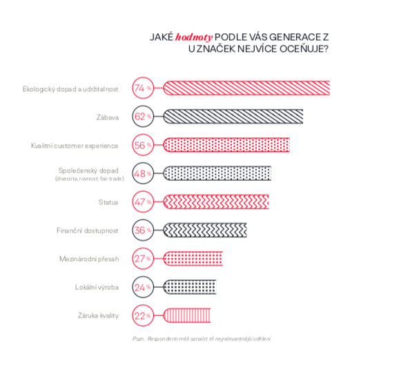 Vybudovat loajalitu generace Z ke značce či produktu není jednoduché. Podle oslovených šéfů komunikace nejmladší generace u značek nejvíce oceňuje hodnoty jako udržitelnost a ohleduplnost k životnímu prostředí (74 %), zábava (62 %) a kvalitní zákaznická zkušenost (56 %).
