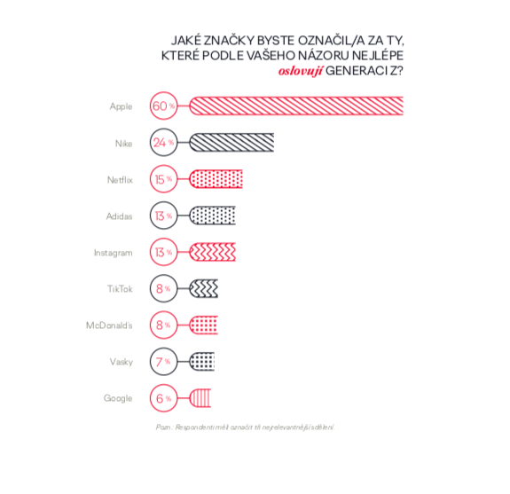 Mezi značkami nejlépe oslovující generaci Z zvítězil výrobce elektroniky Apple, za ním následuje značka Nike a poté Netflix. Mezi dalšími zmiňovanými značkami figurují Instagram, TikTok, McDonald’s nebo výrobce kožených bot Vasky.
