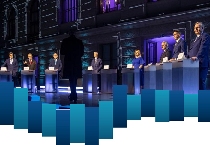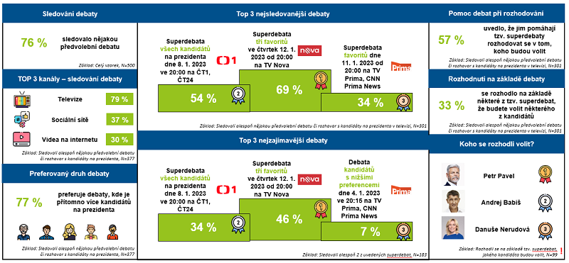 69 % respondentů, kteří sledovali alespoň nějakou debatu či rozhovor s kandidáty na prezidenta, sledovalo před prvním kolem superdebatu tří favoritů (Petr Pavel, Danuše Nerudová a Andrej Babiš) na Nově. Druhou nejsledovanější pak byla debata všech kandidátů na ČT1 a ČT24, kterou vidělo 54 % dotazovaných. 34 % uvedlo superdebatu favoritů na TV Prima a CNN Prima News. Pouze 4 % dotazovaných nesledovalo ani jednu z pěti uvedených předvolebních debat.