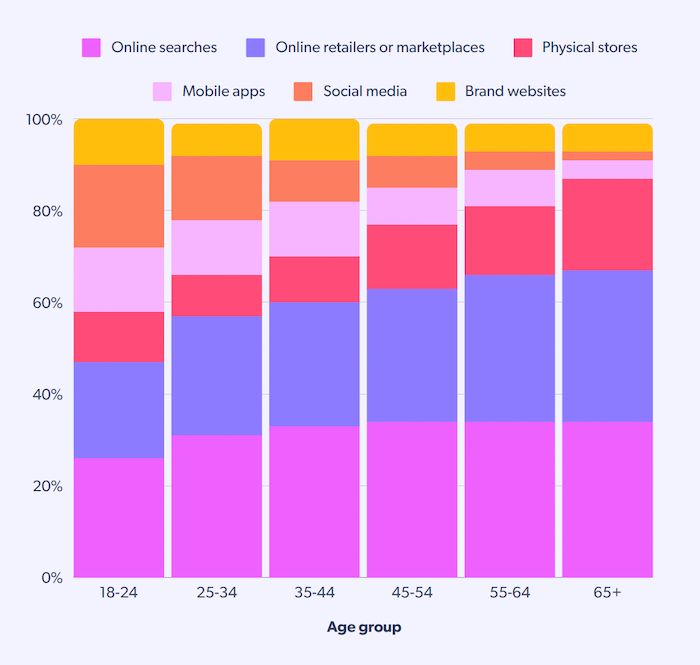 Na začátku nákupní cesty využívají nakupující nejčastěji online vyhledávání (32 %), vyhledávání na e-shopech či online tržištích typu Amazon (29 %), kamenné obchody (14 %), mobilní aplikace (9 %), weby značek (8 %) a sociální média (8 %). Zatímco starší generace volí častěji vyhledávání všeho druhu, generace Z ve věku 18 až 24 let spoléhá nejvíce ze všech věkových skupin na sociální sítě.
