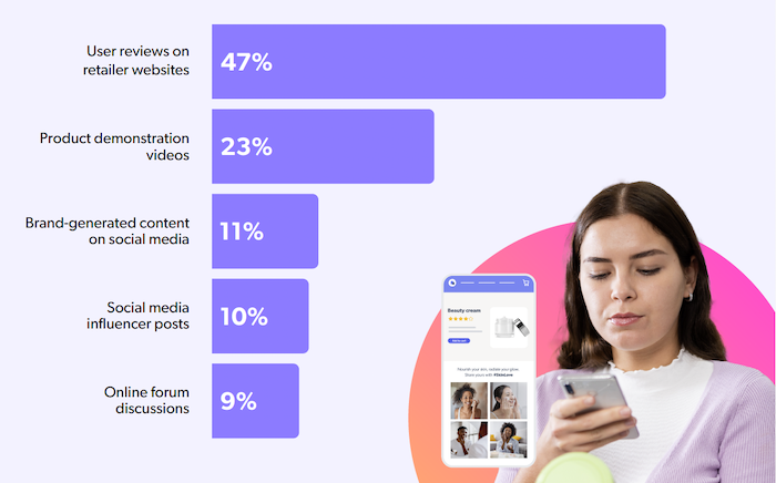 Nejčastěji si spotřebitelé přes USG vyhledávají elektroniku (62 %), módu (46 %) a kosmetiku (42 %). A hledají ji nejvíce na webových stránkách obchodníků (47 %), ve videích demonstrujících daný produkt (23 %), ve značkovém obsahu na sociálních sítích (11 %) a u influencerů (10 %). Pro mladou generaci je přitom více než pro starší ročníky důležité, aby byla případná spolupráce se značkou, sponzoring či jakékoliv partnerství, transparentně komunikována. Zásadní je to pro 28 % respondentů z generace Z, 26 % mileniálů, a jen 12 % lidí starších 65 let.