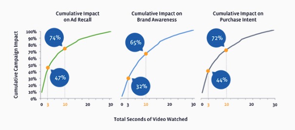 Další zkoumání kumulativního dopadu kampaně ukázalo, že sledování reklamy po dobu kratší než 3 vteřiny přináší až 47 procent hodnoty kampaně. Zhlédnutí do 10 vteřin už pak přináší dokonce 74 procent kumulativního výkonu kampaně. To v praxi znamená, že i když efekt kampaně s délkou sledování videa roste, lidé nemusí nutně reklamu vidět až do konce, aby jí byli ovlivněni. I méně než 10 vteřin reklamy dokáže účinně budovat povědomí o značce a posilovat nákupní chování.
