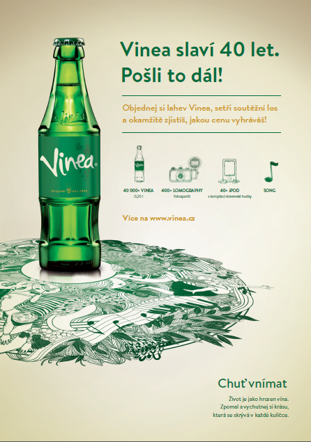 Slovenská nápojová značka Vinea slaví své 40. výročí. U této příležitosti spustila spotřebitelskou soutěž, jež probíhá ve vybraných restauracích, barech či kavárnách v ČR a na Slovensku. Vyhrát lze například fotoaparát Lomography, iPod nebo možnost stažení jedné ze 40 slovenských písní. Výběr slovenských hitovek mapuje uplynulých 40 let – co rok, to hitovka.