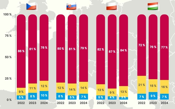 Nejvýraznějším zjištěním je pokles obav o svobodu médií v Polsku, které po zvolení vlády přiklánějící se více k hlavnímu proudu klesly ze 71 % v roce 2023 na 53 % v roce 2024. To kontrastuje se situací na Slovensku a v Maďarsku, kde se obavy o svobodu médií oproti loňskému roku naopak zvýšily.