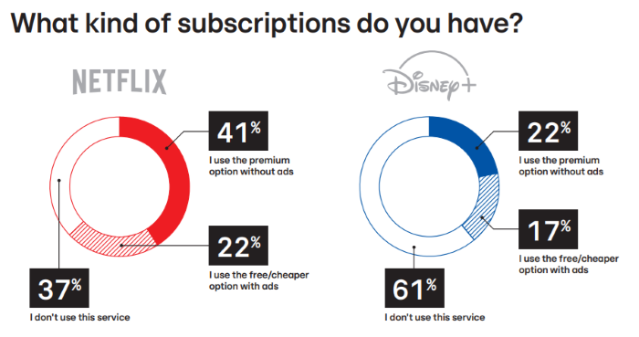 Konkrétně u SVOD služeb je vidět, že Evropané častěji volí modely podporované reklamou nebo levnější služby. K méně nákladným možnostem přechází 29 % respondentů. Netflix si bez reklam předplácí 41 % dotázaných, s reklamou 22 %, v případě Disney+ je to 22 %, respektive 17 %.