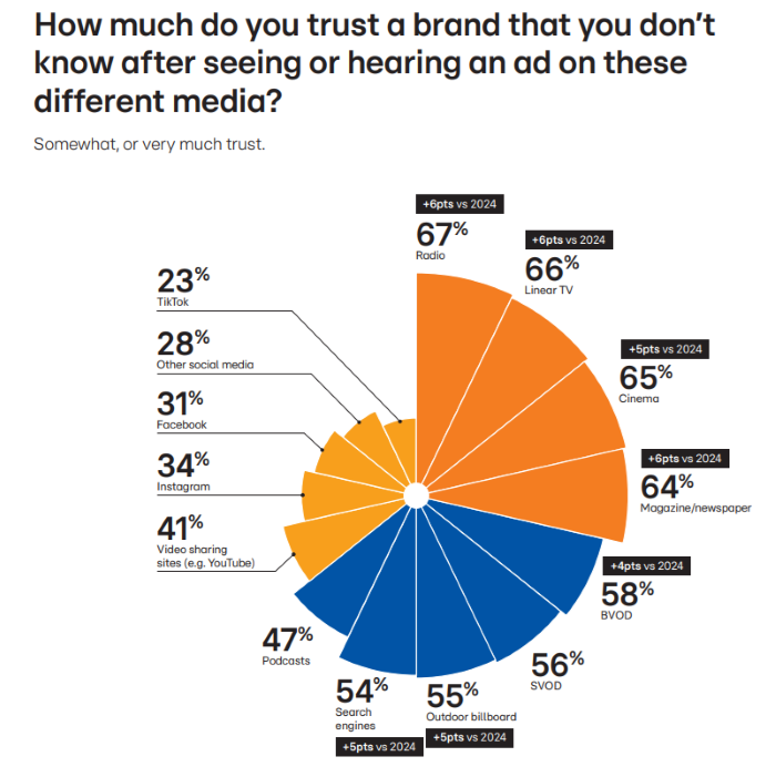 Klasická média se stále těší mnohem větší důvěře než sociální sítě, u nich naopak vzhledem k nárůstu dezinformací a fake news důvěryhodnost klesá. Nejméně důvěry má u uživatelů TikTok. Reklamě neznámé značky, která se na něm objeví, by důvěřovalo jen 23 % dotázaných, zatímco pokud by ji slyšeli v rádiu, důvěra by vzrostla na 67 % , v případě televize na 66 %.
