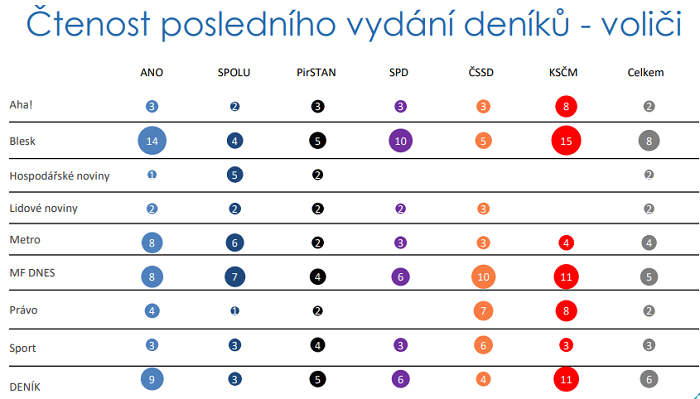 Voliči hnutí ANO jsou nejčastěji zastoupeni mezi čtenáři deníku Blesk, s odstupem potom mezi čtenáři regionálního Deníku a deníků MF Dnes a Metro. Voliči koalice Spolu nejčastěji čtou deníky MF Dnes, Metro a Hospodářské noviny. V případě voličů koalice PirSTAN je zastoupení ve čtenosti deníků vyrovnané a rozprostřené mezi Deník a Blesk a také mezi MF Dnes a Sport. Voliči SPD nejčastěji čtou Blesk a voliči ČSSD zase MF Dnes. Deník Právo je u voličů ČSSD na druhém místě. V případě voličů KSČM je nejčtenější Blesk.